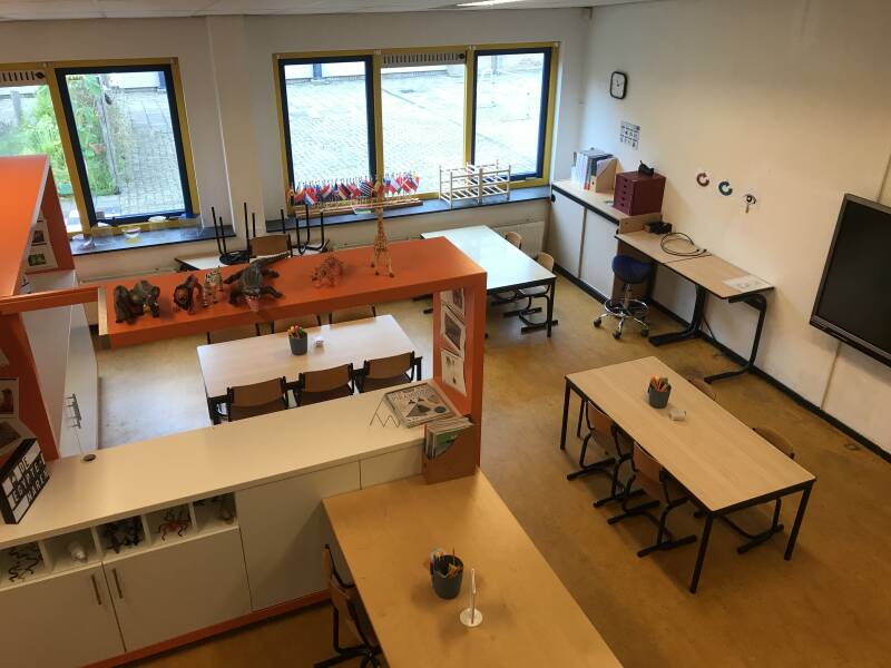 Het oude lokaal van juf Bettina is nu het kosmisch lokaal geworden. Onze grote oranje kasten die we ooit van een bankgebouw kregen staan nu hier in. Het oude lokaal van juf Carmen is nu 'prikkelarm instructie- en toetslokaal'. De onderbouw houdt een eigen lokaal. Dat was vorig jaar al vernieuwd.